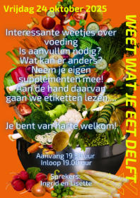 Neem een kijkje bij mijn YouTube kanaalover voeding en de darmflora:Nutrition inside Knowledge!Vrijdag 24 oktoberh 2025Interactieve WorkshopWeet wat je eetMeer informatie over deze interactieve workshop vind je via deze link.Inloop vanaf 19.15 uurStart: 19.30 uur -Einde ca 21.00 uurLocatie: Oosteinde 179, 2611 VD DelftAanmelden: via email